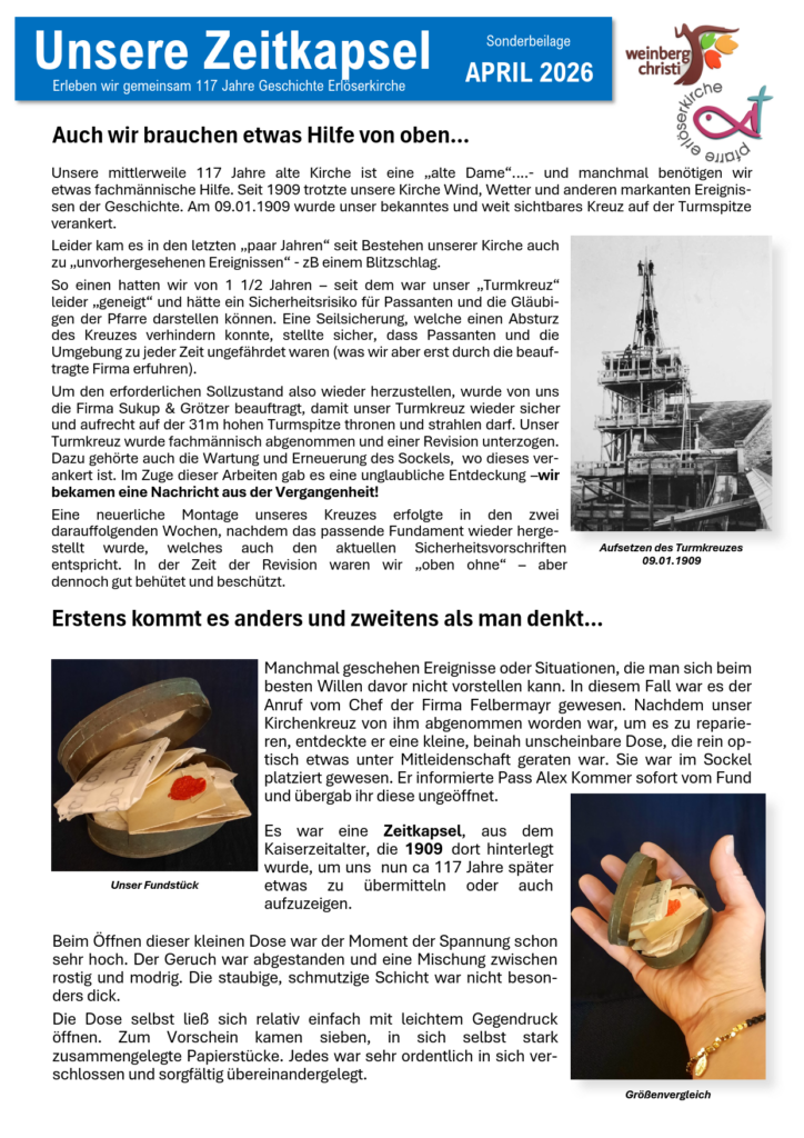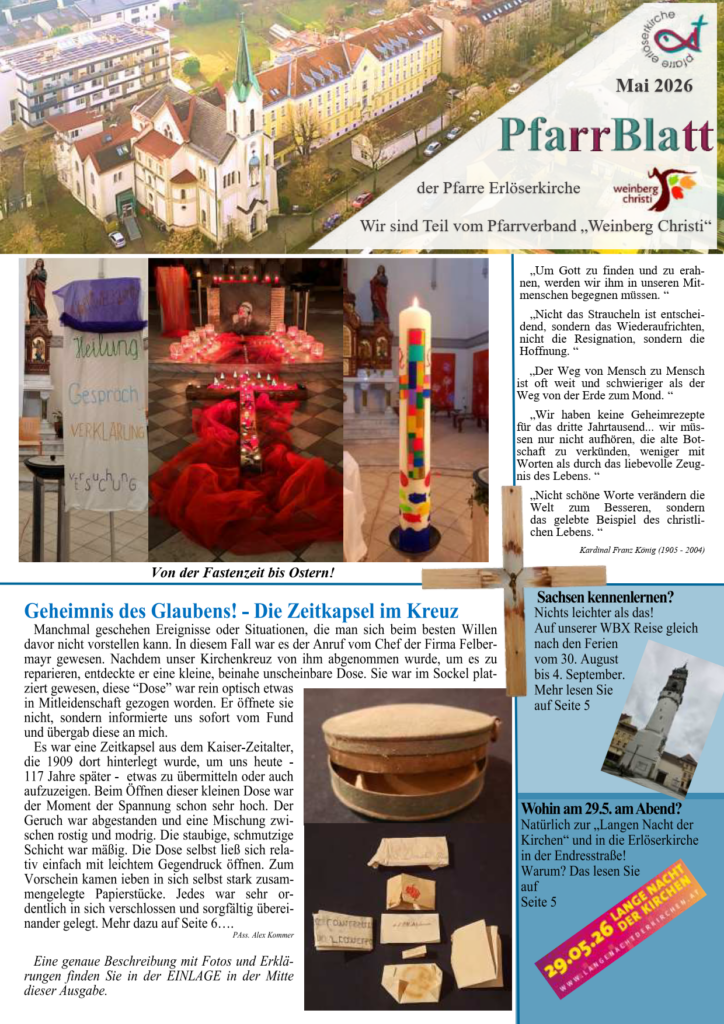 Ab sofort erhalten Sie unser neues Pfarrblatt in der Kirche/Foyer und hier bei uns Online. Lesen Sie eine Nachschau über Ostern und über eine spannenden Entdeckung, die uns alle „mehr“ als Überrascht hat.!