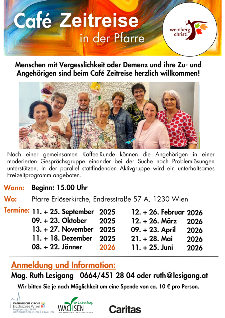 Beim Café Zeitreise wird bei 14-tägigen Treffen zunächst in bunter Runde Kaffee getrunken und geplaudert. Anschließend haben die Angehörigen Gelegenheit zum Erfahrungs- und Informationsaustausch. Für Menschen mit Gedächtnisproblemen oder Demenzerkrankung gibt es parallel dazu ein Bewegungsprogramm für Geist und Körper. Dabei stehen Spaß und kleine Erfolgserlebnisse im Mittelpunkt.