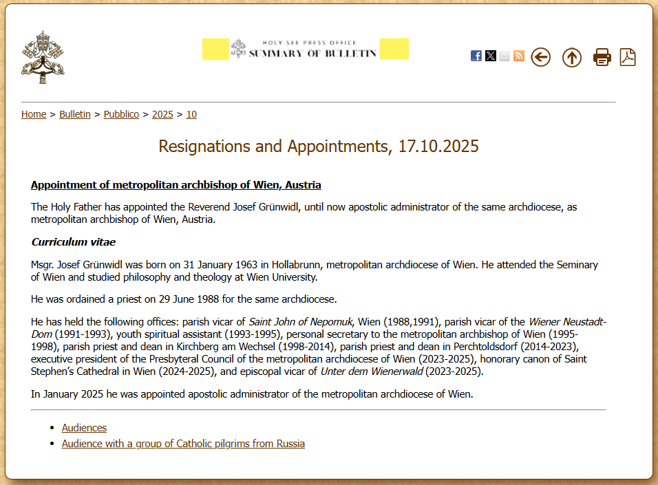 Heute Mittag, Freitag, 17 Oktober 2025, hat der Vatikan die Entscheidung des Papstes, Josef Grünwidl zum künftigen Erzbischof der Erzdiözese Wien zu ernennen, in seinem Amtsblatt „Bollettino“ veröffentlicht und damit gültig gemacht. In einer ersten Erklärung sagt der designierte Erzbischof dazu: