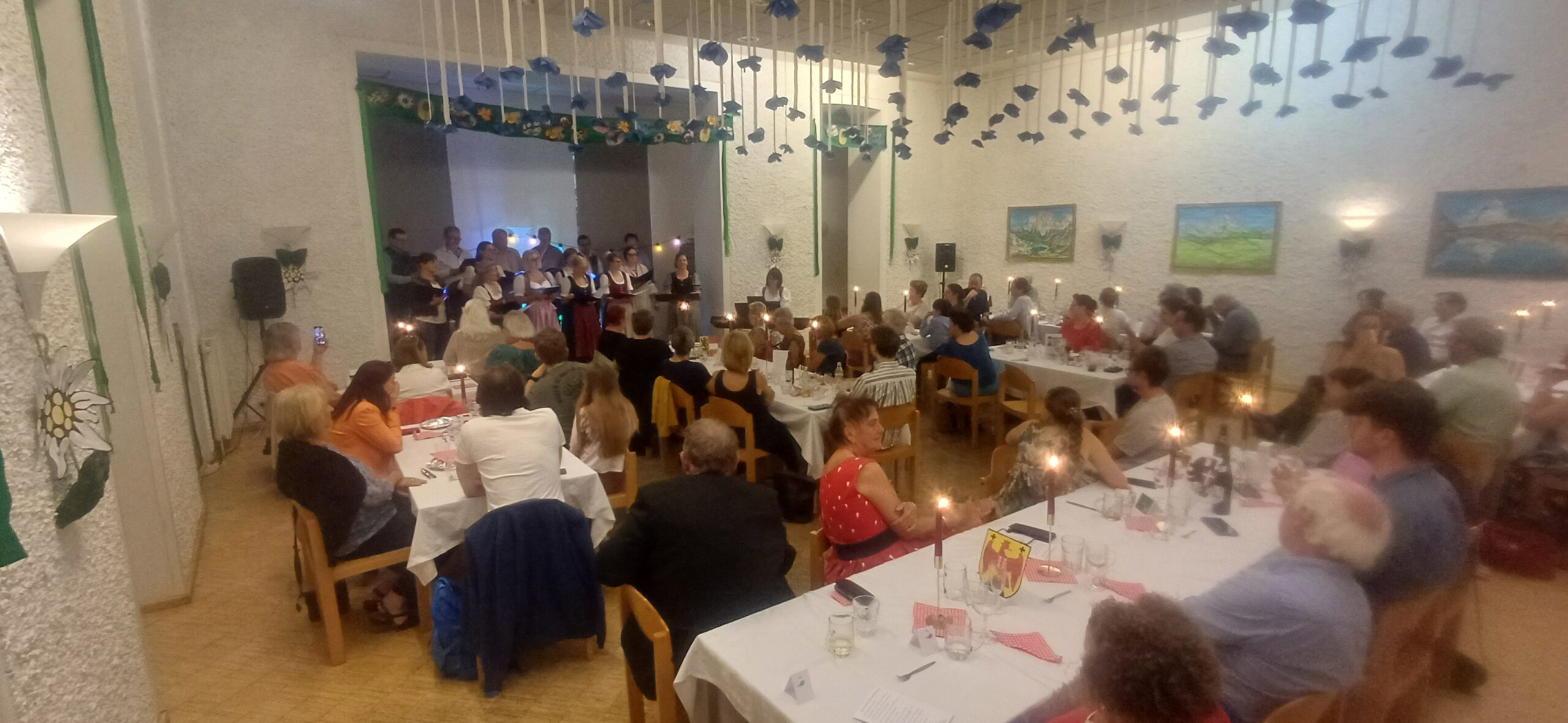 Als Hauptspeise gab es entweder Schweinsbraten mit Semmelknödeln oder einen veganen Erdäpfelgulyas. So war auch die altösterreichische Kulinarik gut vertreten, wobei erfreulicherweise auf alternative Ernährungsweisen durchgehend Rücksicht genommen wurde. Die Nachspeise war- sehr passend- ein Apfelstrudel, und dazu gab es zum Mitsingen „Live is life“ von Opus. Da ließ sich das Publikum nicht zweimal bitten, und als Zugabe gab es noch einmal den „Banküberfall“ der EAV in der Chorversion. Das Schöne war, dass das Publikum bei diesem stimmungsvollen Konzert auch genug Zeit hatte, sich zwischendurch zu unterhalten, weil es immer wieder Pausen gab.